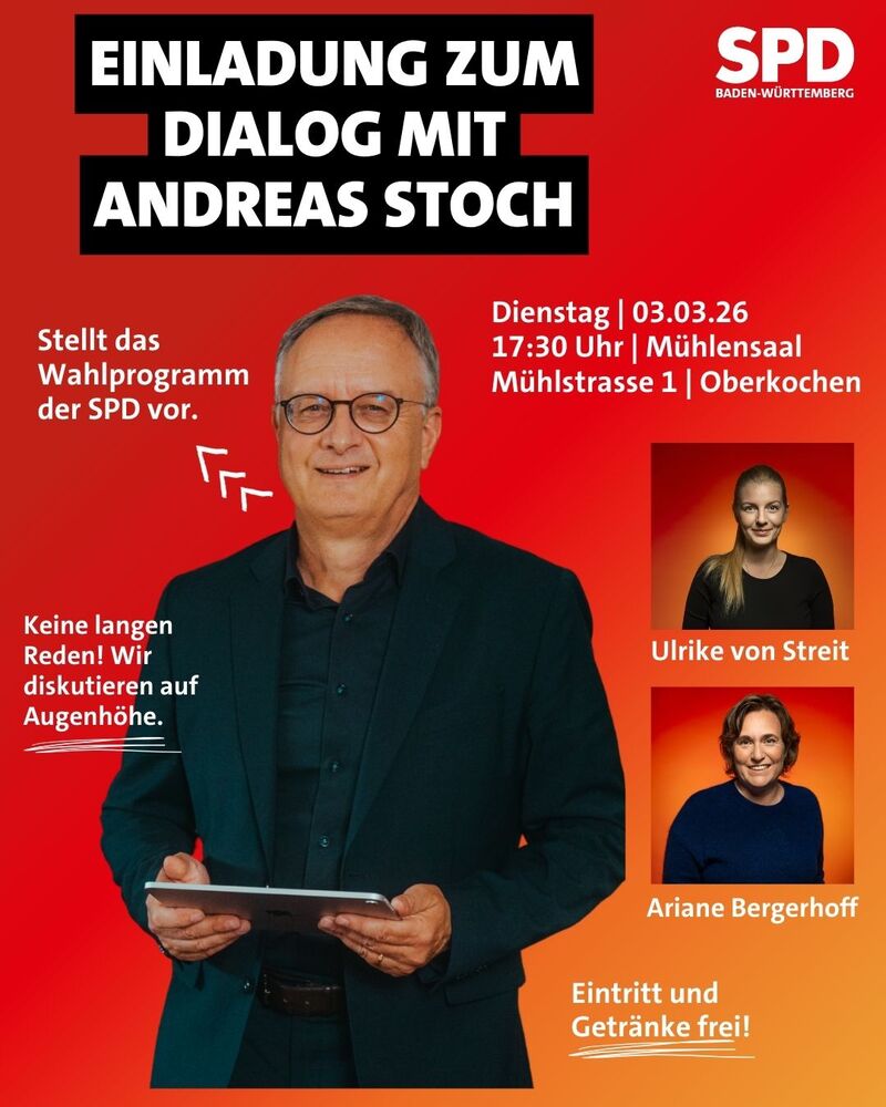 wir freuen, dass unser Spitzenkandidat Andreas Stoch im Rahmen des anstehenden Wahlkampfes nach Oberkochen kommt. Die Tour macht Andreas Stoch durch alle Regionen unseres Bundeslandes und gibt allen Interessierten die Möglichkeit, direkt vor Ort über die Themen der SPD ins Gespräch zu kommen.